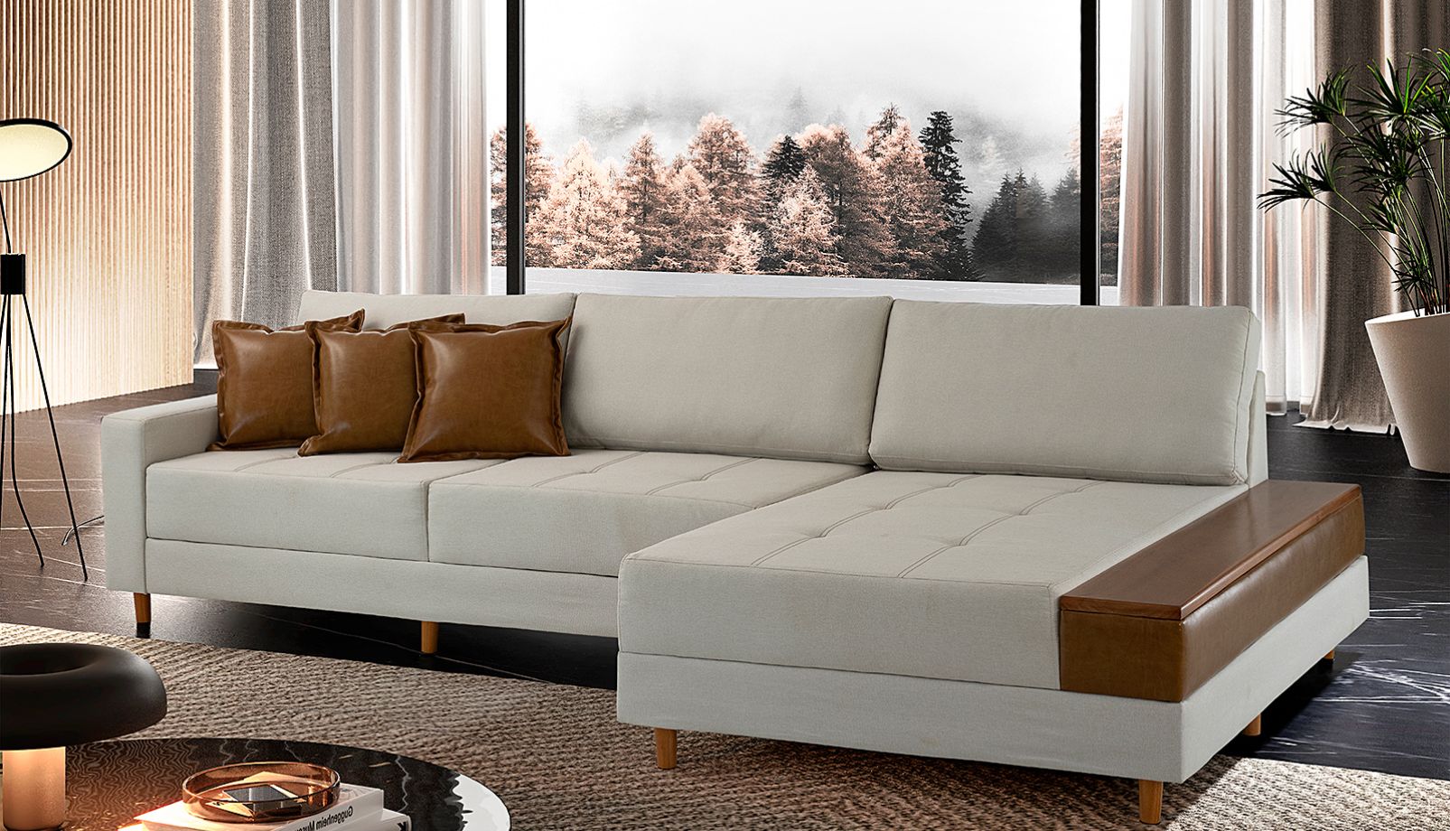 Braços com detalhe de acabamento em madeira lateral da chaise, parafusados, facilitando a desmontagem caso necessário.